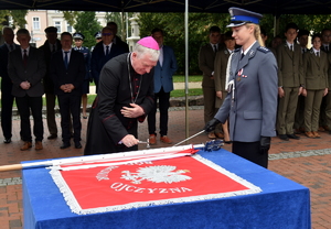 Następnie odczytane zostały akty nadania i wręczenia Sztandaru dla Komendy Powiatowej Policji w Tucholi, a w drzewce wbite zostały honorowe gwoździe. Poświęcenia Sztandaru Komendy Powiatowej Policji w Tucholi dokonał Ordynariusz Diecezji Pelplińskiej Ks. Biskup Ryszard Kasyna.