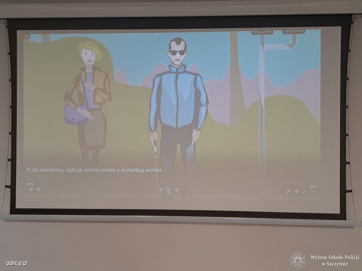 Tematyka szkolenia uwzględnia różne aspekty komunikacji z osobami z niepełnosprawnością wzroku. Szkolenie ma formę interaktywnych warsztatów. Prowadząca podczas zajęć używa specjalnych okularów-gogli, symulujących różne ubytki wzorku czy choroby oczu, dzięki temu uczestnicy mogą poczuć jakie trudności sprawiają podstawowe czynności, takie jak: poruszanie się, omijanie przeszkód, czytanie, podpisywanie dokumentów czy komunikowanie się z policjantami i innymi osobami. Ćwiczenia mają na celu pokazanie w jaki sposób pomóc osobie niewidomej lub niedowidzącej oraz zwrócenie uwagi na problemy jakie napotykają te osoby w przestrzeni publicznej. Zajęcia prowadzi Anna Dąbrowska z Biura Komunikacji Społecznej Komendy Głównej Policji.