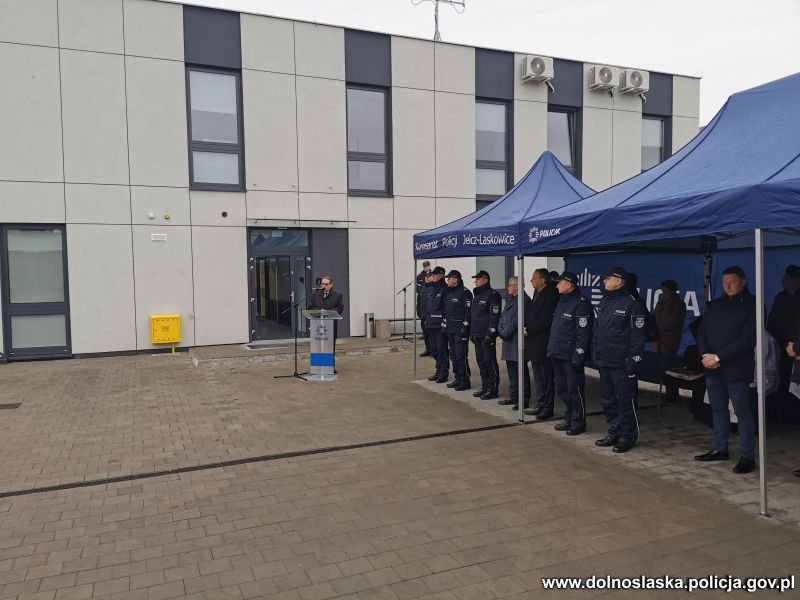 Podczas spotkania I Zastępca Komendanta Głównego Policji nadinsp. Dariusz Augustyniak przekazał symboliczny klucz do nowej jednostki Komendantowi Komisariatu Policji w Jelczu-Laskowicach nadkom. Piotrowi Jasiewiczowi. Nadinsp. Augustyniak podkreślił, że to już kolejna nowoczesna jednostka Policji otwarta w tym roku na terenie garnizonu dolnośląskiego. Wspomniał także, że dzięki przygotowanym planom modernizacyjnym powstają nie tylko nowe policyjne budynki, ale również każdego roku wymieniany jest wykorzystywany przez policjantów i pracowników sprzęt. Głos zabrał także poseł Paweł Hreniak, który odczytał list okolicznościowy napisany przez Marszałek Sejmu Rzeczypospolitej Polskiej Elżbietę Witek, która pogratulowała funkcjonariuszom tego nowego obiektu oraz życzyła, aby służył zarówno im, jak i mieszkańcom regionu. Również poseł Paweł Hreniak przypomniał, że w tych niespokojnych czasach bezpieczeństwo jest podstawą. W podobnym tonie wypowiadał się także Wojewoda Dolnośląski Jarosław Obremski, który również życzył, aby nowa jednostka była miejscem, gdzie mieszkańcy znajdą pomoc. Swoje słowa do zebranych osób skierował także Starosta Oławski Zdzisław Brezdeń oraz Burmistrz Miasta i Gminy Jelcz-Laskowice Bogdan Szczęśniak. Obaj podkreślili, że dzięki świetnej współpracy pomiędzy samorządami a Policją, możliwe są tak duże inwestycje, jak budowa wspomnianego komisariatu, ale też stałe wsparcie finansowe umożliwiające m.in. zakup radiowozów oraz realizację służb ponadnormatywnych. Część poświęconą przemówieniom zakończył Komendant Wojewódzki Policji we Wrocławiu nadinsp. Dariusz Wesołowski, który przede wszystkim podziękował funkcjonariuszom za ich codzienną służbę oraz zaangażowanie w niesienie pomocy mieszkańcom. Podkreślił jak ważne jest to, że nowoczesny budynek będzie służył teraz przez kolejne lata lokalnej społeczności i funkcjonariuszom oraz pracownikom Policji z Jelcza-Laskowic.