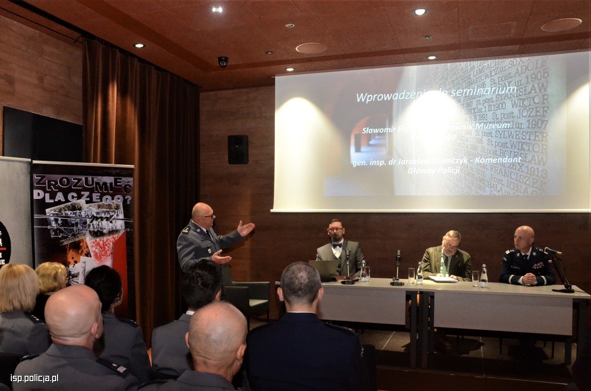 W konsekwencji, we wrześniu 2022 roku w siedzibie Muzeum Katyńskiego w Warszawie odbyło się seminarium eksperckie pn. „Zrozumieć dlaczego? Prawa człowieka w edukacji retrospektywnej funkcjonariuszy Policji i Straży Granicznej. Fakty – Rzeczywistość – Wyzwania”. Celem seminarium było przeprowadzenie wykładów eksperckich oraz dyskusji i wypracowanie rekomendacji dla realizacji cykli szkoleń dla policjantów i funkcjonariuszy Straży Granicznej w obszarze praw człowieka, etyki zawodowej i równego traktowania w oparciu o artefakty zgromadzone w Muzeum Katyńskim oraz innych miejscach pamięci o martyrologii ludzi zamordowanych w czasach systemów reżimowych związanych głównie z historią Polski. Seminarium otworzył wspólnie z gen. insp. dr. Jarosławem Szymczykiem – Komendantem Głównym Policji, Sławomir Frątczak – Kierownik Muzeum Katyńskiego. Placówka ta od wielu lat zaangażowana jest we współpracę z Policją, lecz pandemia istotnie zakłóciła plany edukacyjne. Sławomir Frątczak wspomniał o misji tworzenia Muzeum Katyńskiego opisując bogatą historię jego tworzenia z dbałością o każdy szczegół i utrzymanie miejsca w tonacji martyrologicznej, ale wypełniającej misję edukacyjną, informacyjną, naukową, ale także epitafijną. Na ręce Komendanta Głównego Policji złożona została deklaracja o współpracy w zakresie edukacji policjantów w oparciu o zbiory muzealne, ale także zatrudnioną tam kadrę. Gen. insp. Jarosław Szymczyk wskazał na to, jak ważna jest tego rodzaju edukacja w szeregach Policji, aby upamiętniać męczeńską śmierć tysięcy zamordowanych żołnierzy, policjantów i przedstawicieli innych formacji i prowadzić efektywną edukację współczesnych policjantów bazując na bolesnych doświadczeniach z przeszłości. W kontekście powtarzającej się historii niosącej ze sobą zło i okrucieństwo nawiązał do swoich doświadczeń z wizyt w Ukrainie i widoku ciał zamordowanej ludności cywilnej i jednoznacznymi skojarzeniami z dołami śmierci, w których często bezimiennie spoczęli polscy funkcjonariusze zamordowani w ramach Zbrodni Katyńskiej. Istotnym wyznacznikiem seminarium było poszukiwanie efektywnych sposobów na łączenie historii ze współczesną psychologią i socjologią zachowań międzyludzkich w kontekście przygotowania oferty edukacyjnej dla funkcjonariuszy w zakresie edukacji na rzecz ochrony praw człowieka i przestrzegania zasad etyki zawodowej. Dzięki zaangażowaniu ekspertów i ekspertek zaproszonych do udziału w seminarium udało się wypracować wstępne rekomendacje, których istota sprowadza się do opracowania formuły szkoleniowej, którą cechować będzie apolityczność, neutralność, obiektywizm, opieranie się na bezsprzecznych faktach historycznych i niekwestionowanej wiedzy naukowej. Głównymi odbiorcami seminarium byli policyjni pełnomocnicy ds. ochrony praw człowieka oraz funkcjonariusze Straży Granicznej jako regionalni edukatorzy i animatorzy edukacji zawodowej. Sławomir Frątczak w sposób niezwykle interesujący przedstawił potencjał edukacyjny Muzeum Katyńskiego w ramach wystąpienia pt. „Muzeum Katyńskie – Dom Rodzin Katyńskich”. Z wielką wrażliwością opowiadał o zgromadzonych w Muzeum artefaktach stanowiących niekwestionowany dowód zbrodni dokonanej na polskich funkcjonariuszach w ramach szeroko rozumianej Zbrodni Katyńskiej. Przybliżył uczestnikom symboliczny wymiar konstrukcyjny Muzeum, który dziś jest swoistego rodzaju Domem Rodzin Katyńskich.