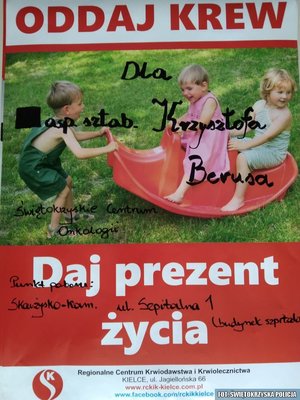 Aspirant sztabowy Krzysztof Berus z Komisariatu Policji w Suchedniowie od przeszło 23 lat służy w Policji, od 15 lat jest dzielnicowym. Podczas codziennej służby zawsze stawał na straży prawa i pomagał innym w życiowych problemach. Nigdy nie przeszedł obojętnie obok potrzebujących pomocy. Za swoją aktywność, wiedzę i zaangażowanie niejednokrotnie dziękowali mu podopieczni ze służbowego rejonu. Dziś aspirant sam potrzebuje pomocy. Podstępna choroba zaatakowała nagle i niespodziewanie. Zwracamy się z prośbą o oddawanie krwi na rzecz potrzebującego policjanta, który aktualnie przebywa w szpitalu i potrzebuje najcenniejszego z lekarstw. Krew można oddawać w dowolnych oddziałach krwiodawstwa i krwiolecznictwa z dopiskiem „Dla Krzysztofa Berusa”.