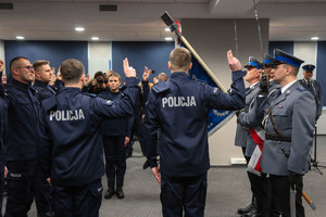 Nadinsp. Michał Ledzion odczytał słowa roty ślubowania, które powtarzali za nim adepci sztuki policyjnej. Następnie, każdemu z nich wręczył legitymacje służbowe, a Łukasz Kmita Wojewoda Małopolski wręczył ślubującym zasady etyki zawodowej. Wspólnie pogratulowali nowoprzyjętym funkcjonariuszom wyboru zawodu.