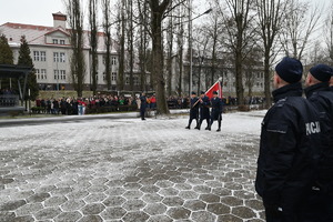 Przed ropoczeciem uroczystego apelu złożone zostały kwiaty przez delegcję pod Tablicą Pamięci poświęconej podkom. Tadeuszowi Bartosikowi, który 28 stycznia 2006 r. pełnił słuzbę patrolową podczas Międzynarodowych Targów Gołębi Pocztowoych w Chorzowie. Zginął w katastrofie budowlanej, przygnieciony metalowymi elementami konstrukcji dachu.