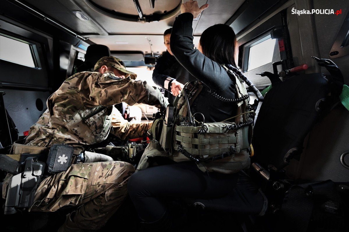 Sporym zaskoczeniem dla Pani Iwony było spotkanie z policyjnymi komandosami. Mundurowi przyjechali do komendy Turem - ważącym „zaledwie” 12 ton, transporterem opancerzonym. Oprócz przejażdżki tym potężnym pojazdem, nasz gość miał okazję zobaczyć inne wyposażenie militarne Samodzielnego Pododdziału Kontrterrorystycznego Policji w Katowicach, otrzymując na koniec m.in. pamiątkowe naszywki.