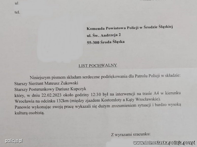 Do Komendy Powiatowej Policji w Środzie Śląskiej wpłynął list pochwalny z podziękowaniem dla policjantów średzkiej drogówki, którzy wobec kierującej wykazali się bardzo wysoką kulturą osobistą i dużym zrozumieniem sytuacji podczas wykonywania swoich obowiązków służbowych.
