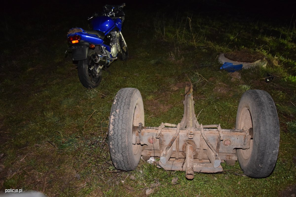 Doczepiony do ciągnika rolniczego drewniany wóz rozpadł się na dwie części. Kierowca traktora z fragmentem uszkodzonego wozu ruszył z miejsca zdarzenia. Przejechał tak kilkadziesiąt metrów, następnie odpiął uszkodzony fragment przyczepy i odjechał w nieznanym kierunku. Policjanci, którzy pracowali na miejscu, szybko odnaleźli ciągnik rolniczy, który brał udział w wypadku. Okazało się, że sprawca pozostawił go na posesji swojego znajomego, a sam uciekł w nieznanym kierunku.