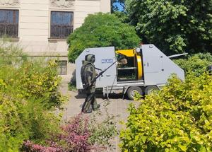 W drugim dniu części praktycznej warsztatów (5 lipca 2023 r.) w rejonie Placu Szczepańskiego w Krakowie przeprowadzono kolejne epizody szkoleniowe. W obiekcie Pałac Sztuki mieszczącym się na Pl. Szczepańskim 4 w Krakowie nastąpiła - hipotetyczna - eksplozja ładunku wybuchowego, w wyniku której doszło do uszkodzenia elewacji budynku oraz pożaru. Jednocześnie, w pobliżu zostało ujawnione urządzenie zawierające prawdodobnie materiały wybuchowe. Na miejsce zostaje skierowany patrol Policji, policyjna grupa rozpoznania minersko – pirotechnicznego, PSP, Straż Miejska Miasta Krakowa. Policja podjęła działania zmierzające do ograniczenia ruchu pojazdów w rejonie zdarzenia, zapewniając drożność dróg dojazdowych dla podmiotów uczestniczących w działaniach. Straż Miejska Miasta Krakowa prowadziła działania wspierające pracę Policji w kierowaniu ruchem. Policyjni pirotechnicy z psem do nawęszenia zapachu materiałów wybuchowych ujawnili materiały wybuchowe i przystąpili do ich neutralizacji z wykorzystaniem specjalistycznego wielozadaniowego robota pirotechnicznego. Tymczasem żołnierze Wojskowego Zgrupowania Zadaniowego ZAMEK, wydzielonych sił Państwowej Straży Pożarnej, Wojskowej Straży Pożarnej oraz Zespołu CIMIC wspomaganego przez eksperta z Wojewódzkiego Urzędu Ochrony Zabytków w Krakowie zrealizowały skoordynowane działania polegające na zabezpieczeniu terenu po eksplozji, gaszeniu pożaru i ewakuacji osób oraz dóbr kultury z Pałacu Sztuki a także raportowaniu zniszczeń obiektu zabytkowego. Ze względu na charakter realizowanych działań oraz przeprowadzone ustalenia w trakcie całego zdarzenia, równolegle swoje czynności wykonywała (aplikacyjnie) policyjna grupa operacyjno – procesowa.