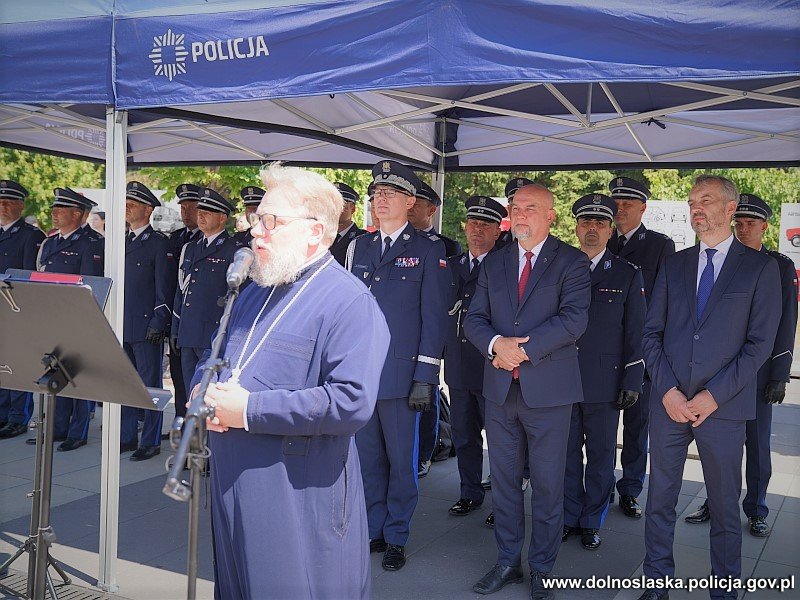 Nie zabrakło też słów otuchy i jakże ważnego duchowego wsparcia, ze strony ks. protojereja Grzegorza Cebulskiego oraz kilku słów ze strony dr Andrzej Jerie - Dyrektora Ośrodka „Pamięć i Przyszłość” mieszczącego się w Centrum Historii Zajezdnia. W swoim wystąpieniu dr Jerie złożył gratulacje nowym policjantom, a także podziękował za wszelką współpracę przy zabezpieczeniach różnego rodzaju wydarzeń odbywających się przy lub w zajezdni i wszelkie działania na rzecz popularyzacji historii Wrocławia.