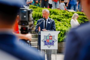 Przyszedł czas na wystąpienie gospodarza dzisiejszych obchodów – szefa świętokrzyskich policjantów nadinspektora dr. Jarosława Kalety. Generał przywitał Komendanta Głównego Policji gen. insp. dr. Jarosława Szymczyka, posłów, senatorów i włodarzy ziemi świętokrzyskiej. Serdecznie powitano komendantów Policji z innych garnizonów, przybyłych przedstawicieli urzędów i zaprzyjaźnionych służb mundurowych, kadrę kierowniczą świętokrzyskiej Policji, policjantów, pracowników cywilnych i wszystkich przybyłych na uroczystość. Generał podziękował także wszystkim policjantkom i policjantom za ich służbę, niejednokrotnie ciężką i trudną, jednak niezwykle ważną. Dziękując wspominał liczne przykłady ratowania życia i odznaczonych policjantów za te zasługi. Nadinspektor dr Jarosław Kaleta złożył także najlepsze życzenia wszystkim funkcjonariuszom garnizonu.