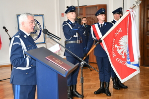 Komendant w swoim wystąpieniu podkreślił, że w rocie ślubowania, którą wypowiedzieli najmłodsi stażem policjanci, zobowiązali się oni służyć obywatelom i strzec ich bezpieczeństwa. Wskazał, jak ważny jest etos i powaga służby policjanta. Podziękował także rodzinom oraz bliskim funkcjonariuszy, za okazane im dotychczas wsparcie. Na zakończenie komendant życzył nowym adeptom zadowolenia i satysfakcji z pełnionej służby.
