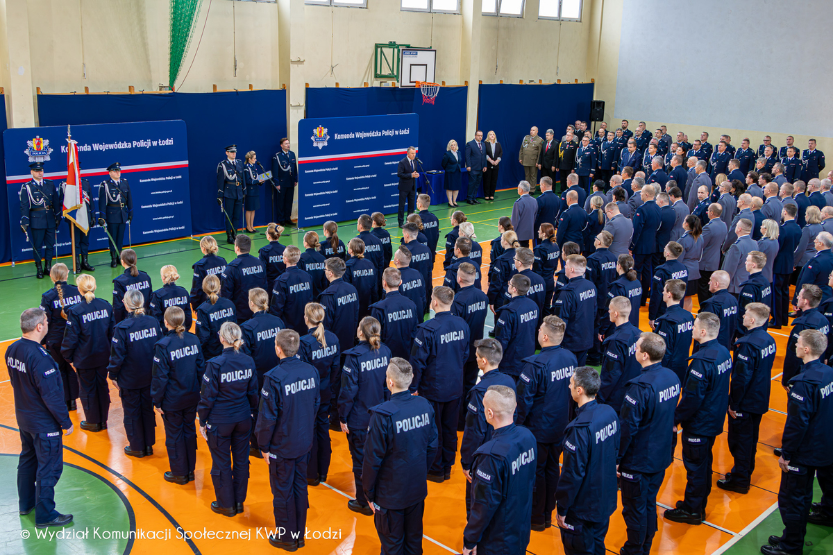 Następnie nowi funkcjonariusze złożyli uroczyste ślubowanie na sztandar, które przyjął Komendant Wojewódzki Policji w Łodzi nadinspektor Sławomir Litwin: "Ja, obywatel Rzeczypospolitej Polskiej, świadom podejmowanych obowiązków policjanta, ślubuję: służyć wiernie Narodowi, chronić ustanowiony Konstytucją Rzeczypospolitej Polskiej porządek prawny, strzec bezpieczeństwa Państwa i jego obywateli, nawet z narażeniem życia. Wykonując powierzone mi zadania, ślubuję pilnie przestrzegać prawa, dochować wierności konstytucyjnym organom Rzeczypospolitej Polskiej, przestrzegać dyscypliny służbowej oraz wykonywać rozkazy i polecenia przełożonych. Ślubuję strzec tajemnic związanych ze służbą, honoru, godności i dobrego imienia służby oraz przestrzegać zasad etyki zawodowej."