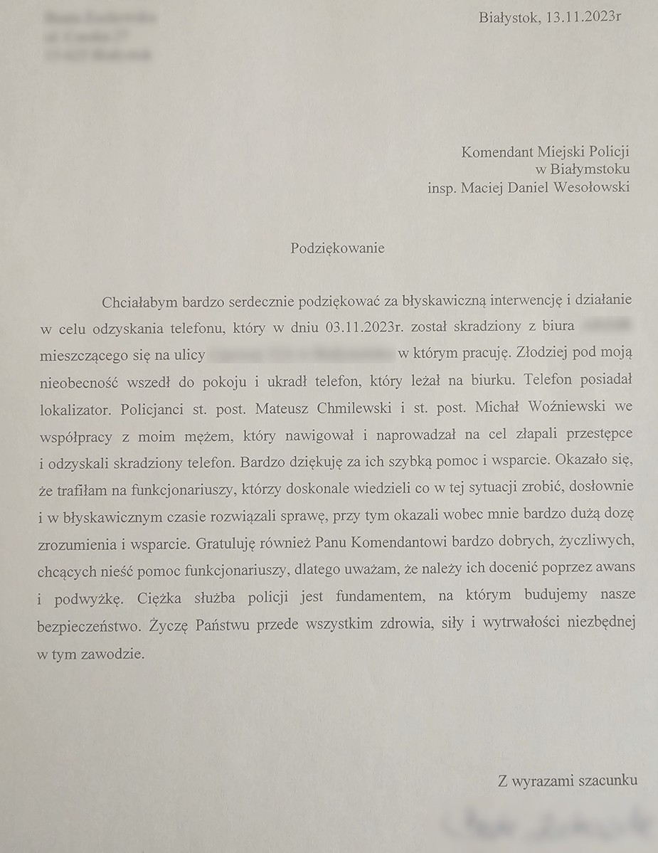 Policjanci z białostockiej patrolówki dostali podziękowania po tym, jak pomogli złapać złodzieja i odzyskać skradziony z biura telefon. W krótkim czasie, przy pomocy męża kobiety, która została okradziona, mundurowi zauważyli mężczyznę wychodzącego z autobusu miejskiego. Z tylnej kieszeni wystawał mu skradziony telefon.
