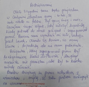 Podczas takiej służby około trzech tygodni temu policjanci z gostynińskiej drogówki sierż. Kamil Ziółkowski i st. post. Szymon Ujazdowski zauważyli, że na poboczu drogi w miejscowości Sierakówek stoi toyota, w której uszkodzeniu uległa przednia opona. Policjanci podjechali do kierującej 61-letniej mieszkanki Łodzi i zaproponowali pomoc. Zadbali o bezpieczeństwo kobiety, a następnie wymienili uszkodzone koło. Gdy wszystko było już w porządku, mieszkanka Łodzi udała się w dalszą podróż do domu. Za pomoc uzyskaną od policjantów postanowiła podziękować, przesyłając list do gostynińskiej komendy.