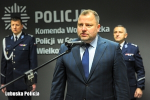 Do nowych policjantów zwrócił się także I Wicewojewoda Lubuski, Pan Dariusz Popławski: „Dziękuję Wam, że wybraliście tak zacny zawód. Będziecie odpowiadać za 1/16 bezpieczeństwa Polski. To jest duże wyzwanie. Ale ja wierzę, że Wasz potencjał, wyszkolenie i wsparcie jakie otrzymacie od Waszych starszych koleżanek i kolegów. Sprawi to, że z dumą będziecie nosić policyjny mundur. Jest to trudna ale zaszczytna służba. Chciałbym podziękować Waszym bliskim za wsparcie jakie będą Wam udzielać na co dzień. Powodzenia”.