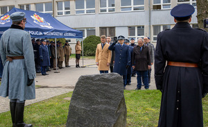 Podczas apelu uczestnicy złożyli kwiaty przed tablicą upamiętniającą ,,Poległych Policjantów II Rzeczpospolitej Polskiej”, symboliczny znicz zapalili nowo ślubujący funkcjonariusze.