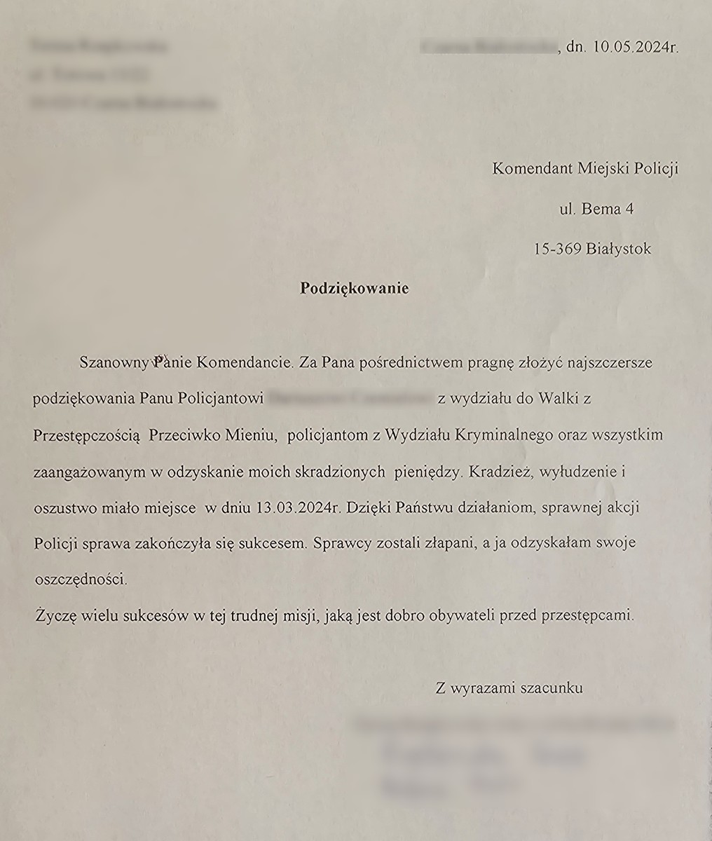 Podziękowania od osób, którym się pomogło, są dla policjantów najwyższym wyrazem uznania. Właśnie takie wpłynęły od wdzięcznej seniorki, która w połowie marca padła ofiarą oszustwa i kradzieży. Seniorka straciła blisko 57 tysięcy złotych. Dzięki współpracy policjantów białostockich komend, pieniądze wróciły do seniorki.