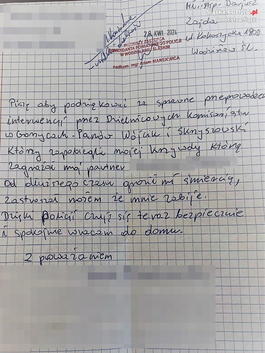 Dzielnicowi interweniowali w związku ze zgłoszeniem stosowania przemocy domowej oraz kierowania gróźb karalnych przez partnera kobiety. Policjanci zatrzymali wówczas agresora, który na wniosek śledczych oraz prokuratora został tymczasowo aresztowany. Kobieta postanowiła pisemnie podziękować za wszystko gorzyckim mundurowym.