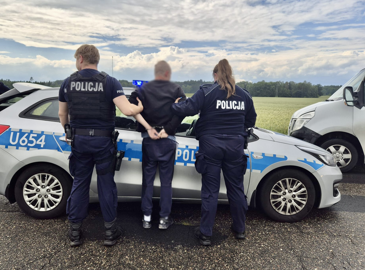Tę sytuację wykorzystał 36-letni mężczyzna, który wsiadł do busa marki Nissan i odjechał w nieznanym kierunku. W trakcie interwencji do pokrzywdzonego zadzwoniła znajoma, która zauważyła jego samochód. Poruszał się on drogą prowadzącą nad jezioro Płotki. Policjanci przejęli rozmowę ze świadkiem i niezwłocznie udali się w pogoń za sprawcą.