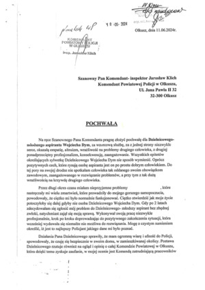 Na ręce Szanownego Pana Komendanta pragnę złożyć pochwałę dla Dzielnicowego młodszego aspiranta Wojciecha Dym, za wzorcową służbę, za z jednej strony niezwykłe serce, okazałą empatię, altruizm, wrażliwość na problemy drugiego człowieka, z drugiej ponadprzeciętny profesjonalizm, konsekwencję, zaangażowanie. Wszystkich epitetów określających sylwetkę Dzielnicowego Wojciecha Dyma nie sposób wymienić. Oprócz pozytywnych cech, które rysują osobę aspiranta jest on po prostu dobrym człowiekiem. Do tej pory na swojej drodze nie spotkałam człowieka tak oddanego swoim obowiązkom zawodowym, zaangażowanego w rozwiązanie problemów, a przy tym z tak dużą wrażliwością na krzywdę drugiego człowieka…