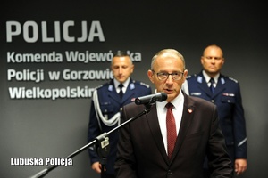 Z kolei Wojewoda Lubuski Marek Cebula zwrócił się do nowych policjantów słowami: „Szanowny Panie Komendancie Wojewódzki, Szanowny Panie Zastępco Komendanta Wojewódzkiego, czcigodny Księże Kapelanie, Pani Przewodnicząca Związków Zawodowych, Panie i Panowie oficerowie, Drodzy funkcjonariusze. którzy przed momentem złożyliście ślubowanie, Najbliżsi tych osób: Policjant Rzeczypospolitej Polskiej, funkcjonariusz, który swoim życiem zaświadcza, że został wychowany w duchu patriotyzmu, podejmuje się trudnego wyzwania- stania na straży porządku ale też zapewnienia bezpieczeństwa innym obywatelom swojego kraju. Nie da się żadnym słowem przecenić Waszych decyzji życiowych. To nie tylko wyzwania ale i zobowiązanie. Myślę, że będziecie wracali w swoim życiu do momentu, kiedy składaliście tutaj w Komendzie Wojewódzkiej Policji w Gorzowie Wielkopolskim ślubowanie. Pan Komendant był uprzejmy życzyć Wam wszystkich awansów. Te mogą sprawić, że będziecie pełnić ważne w Policji funkcje. Życzę Wam tego, by ta służba dawała Wam nie tylko satysfakcję ale i poczucie tego, że dla każdego z nas Wasza obecność daje bezpieczeństwo. Mówię o każdym cywilu który każdego dnia wieczorem kładzie się spać, gdy wy często jesteście na służbie. To dzięki Wam spokojnie do szkoły mogą iść dzieci. To dzięki Wam spokojnie obywatele mogą odpoczywać po pracy. Dziękuje wam za Waszą decyzje, Waszym najbliższym za to, że w duchu patriotyzmu wychowywali Was od najmłodszych lat. Gratuluje złożenia tego ślubowania bo nie każdy by się na to zdobył. Życzę Wam tego. żebyście mieli dużo satysfakcji każdego dnia. Abyście byli bezpieczni i po zakończonej służbie, by spotykały Was dobre słowa. Choć będziecie służyć dwadzieścia cztery godziny na dobę przez siedem dni w tygodniu. Niech Wam ludzie po prostu dziękują za dobrą robotę, a Ja w imieniu wszystkich Lubuszan chcę Wam podziękować za ślubowanie i za to, że taki jest Wasz życiowy wybór i wasze przekonanie w stosunku do nas cywili. Dziękuje bardzo”.