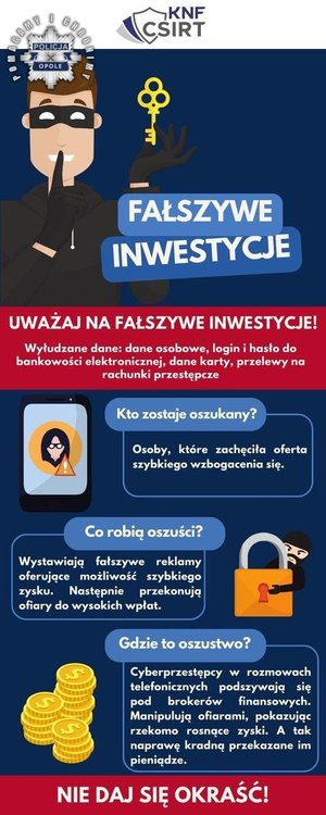 Policjanci z Komendy Miejskiej Policji w Opolu prowadzą sprawę oszustwa, której ofiarą padł 77-letni mieszkaniec powiatu. Mężczyzna na popularnym portalu z filmami, w trakcie reklamy zauważył bardzo korzystną ofertę inwestycyjna, którą miał reklamować znany prezenter. Senior zadzwonił pod podany w ogłoszeniu numer i skontaktował się z rzekomym doradcą finansowym. Oszust podszywający się pod maklera giełdowego przeprowadził mężczyznę przez cała procedurę „zakładania konta”. Następnie 77-latek wpłacił kilkukrotnie swoje oszczędności. Przez kilka tygodni oszuści zwodzili mężczyznę podsyłając mu sfingowane tabele z zyskami. Kiedy mężczyzna chciał wypłacić pieniądze, przestępcy chcieli go jeszcze naciągnąć na „opłaty podatkowe”. Po tym kontakt się urwał. Mężczyzna stracił ponad 475 000 złotych.
