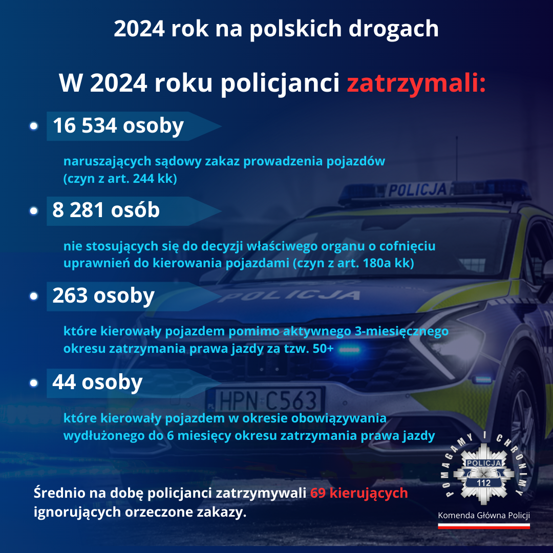 Suma tych przestępstw i wykroczeń to 25 122 przypadki, co oznacza, że średnio dziennie policjanci zatrzymują 69 kierowców, którzy nie powinni prowadzić pojazdów z uwagi na orzeczone zakazy sądowe lub wydane decyzje sądu.