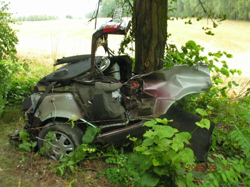 15.08.2008, Rogożno - uderzenie było tak mocne, że pojazd rozpadł się na dwie części -