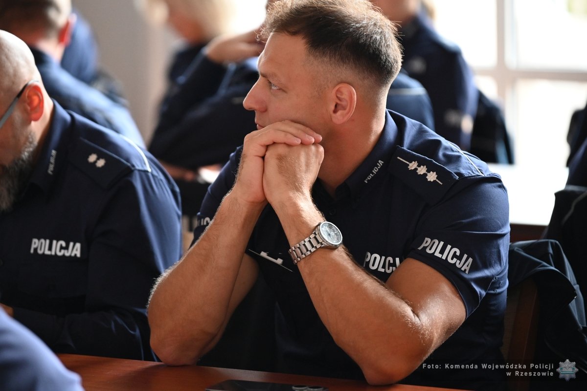 W pierwszej kolejności głos zabrali funkcjonariusze Zarządu w Rzeszowie Centralnego Biura Zwalczania Cyberprzestępczości. Podkom. Piotr Marek, Naczelnik Wydziału Informatyki Śledczej przedstawił zagadnienia związane z pozyskiwaniem informacji o aktualnych zagrożeniach w sieci. W swoim wystąpieniu podkreślił, że wraz z intensywnym rozwojem technologii i postępującej cyfryzacji naszego życia wiedza policjantów w tym zakresie jest niezbędnym elementem przy dostosowywaniu działań prewencyjnych i profilaktycznych. Następnie podkom. Karolina Dykas i asp. Anna Wójcik wskazały na kierunkową profilaktykę związaną z cyberbezpieczeństwem, ze szczególnym uwzględnieniem bezpieczeństwa dzieci i młodzieży. Celem wystąpienia było ujednolicenie przekazu profilaktycznego dostosowanego do różnych grup wiekowych. Jednym z istotniejszych zagadnień wskazanych podczas szkolenia były rozwiązania prawne obejmujące ochronę osób małoletnich przed krzywdzeniem, na które wskazał podkom. Kamil Boroszko, Zastępca Naczelnika Wydziału Operacyjno-Śledczego.