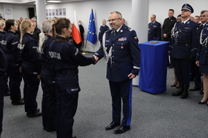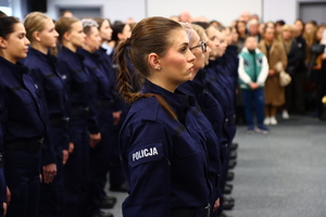 Następnie nowo przyjęci funkcjonariusze na sztandar Komendy Wojewódzkiej Policji zs. w Radomiu złożyli rotę ślubowania: „Ja, obywatel Rzeczypospolitej Polskiej, świadom podejmowanych obowiązków policjanta, ślubuję (...)''. Te słowa, wypowiedziane z głębokim przekonaniem, podkreślają gotowość do stawiania czoła wyzwaniom. W tym roku, gdy świętujemy stulecie kobiecego wkładu w policyjne tradycje, fakt, że 31 z 60 ślubujących to panie, nabiera szczególnego znaczenia, symbolizując siłę i determinację obu płci w budowaniu bezpiecznej Polski.