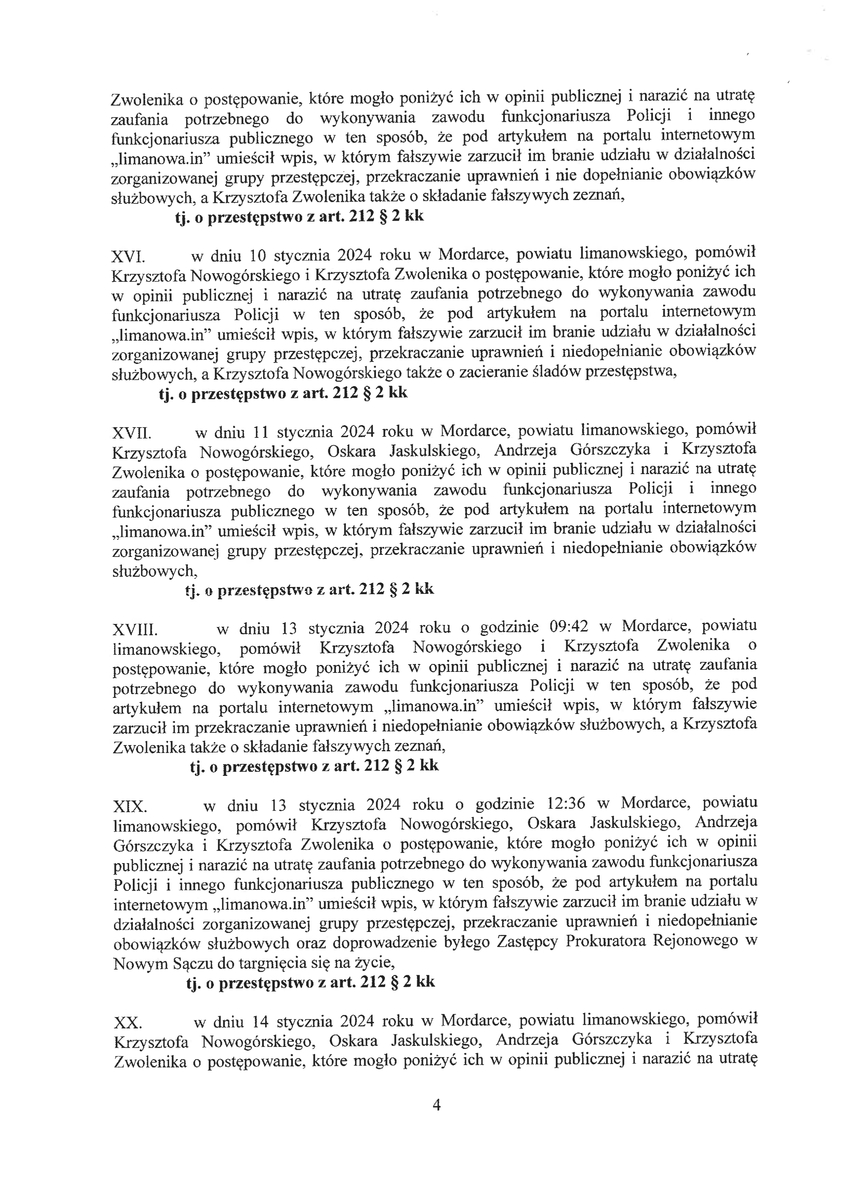Oskarżony w okresie od stycznia 2022 roku wielokrotnie, za pomocą środków masowego przekazu, poprzez zamieszczanie nieprawdziwych informacji pomawiających funkcjonariuszy w komentarzach pod artykułami, a także poprzez samodzielne wpisy publikowane na prowadzonym przez siebie portalu, zniesławił funkcjonariuszy Policji.