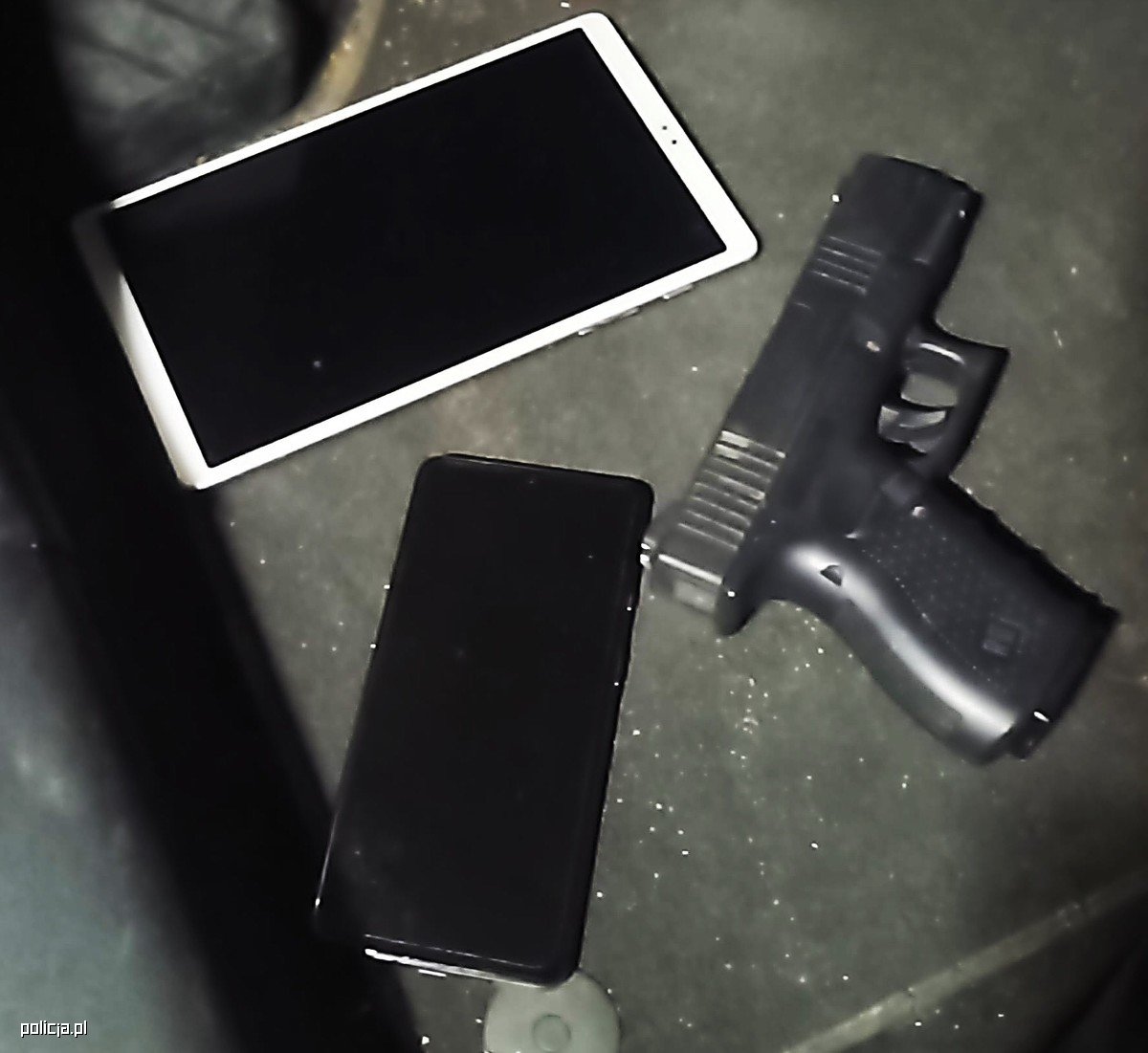 W trakcie czynności funkcjonariusze zabezpieczyli telefony komórkowe, tablet, gotówkę w walucie polskiej i obcej oraz przedmiot przypominający broń palną. Zabezpieczone mienie będzie stanowić materiał dowodowy w toku dalszego postępowania.