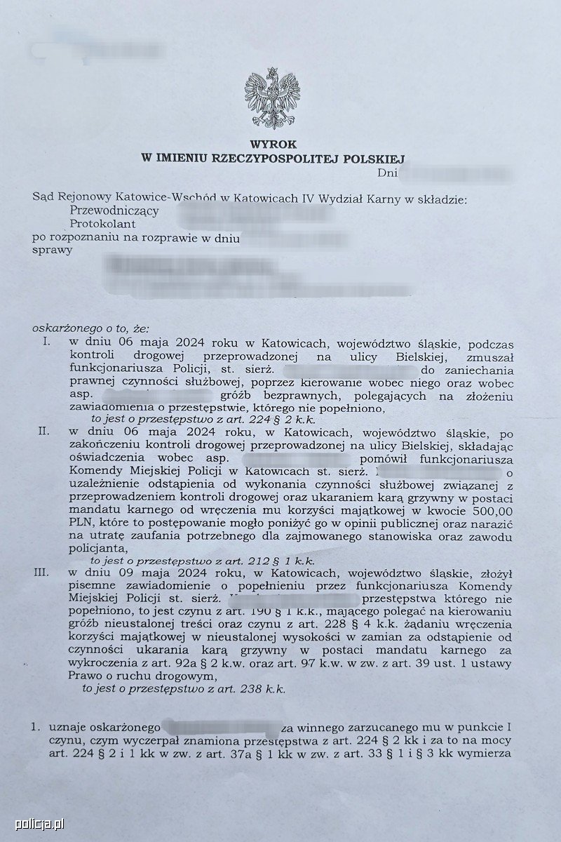 W Sądzie Okręgowym w Katowicach zapadł wyrok w sprawie 70-latka, który podczas kontroli drogowej nie tylko nie przyjął nałożonych na niego mandatów, ale później złożył fałszywe zawiadomienie, oskarżając interweniującego policjanta o działania, których ten nie podjął. Sąd wymierzył mu karę grzywny oraz nawiązkę na rzecz pomówionego policjanta.