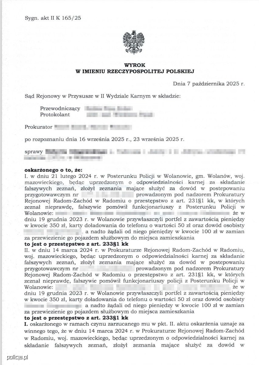 W Sądzie Rejonowym w Przysusze zapadł wyrok w sprawie 52-latka, który złożył fałszywe zawiadomienie, oskarżając policjantów, którzy chcieli mu pomóc o przywłaszczenie portfela z pieniędzmi. Sąd wymierzył mu karę 6 miesięcy pozbawienia wolności w zawieszeniu na 2 lata oraz zadośćuczynienie na rzecz pomówionych policjantów. W ostatnich dniach uprawomocnił się wyrok, który świadczy o tym, że każdy, kto bezpodstawnie oskarży funkcjonariusza musi liczyć się z konsekwencjami prawnymi.