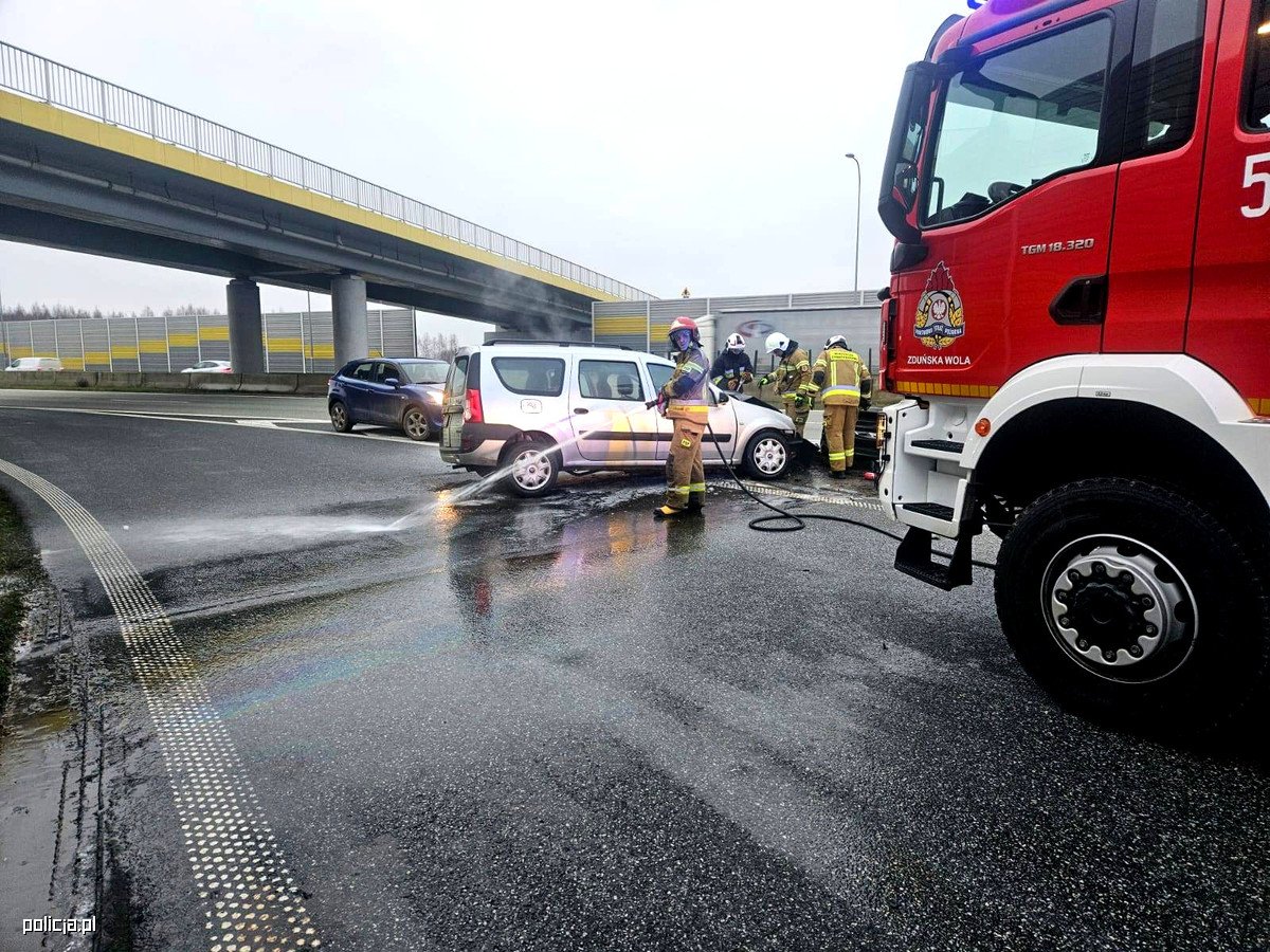 Policjanci zaczęli gasić płonący samochód, ograniczając rozprzestrzenianie się ognia do czasu przyjazdu straży pożarnej, która następnie dogasiła pojazd oraz zabezpieczyła teren. Kierowca z obrażeniami został przewieziony do szpitala. Mężczyzna w rozmowie z policjantami oświadczył, że zasnął za kierownicą w drodze do pracy.