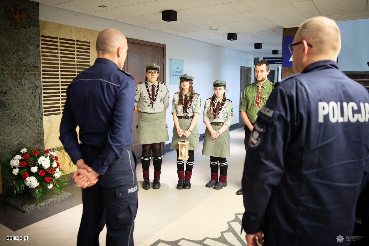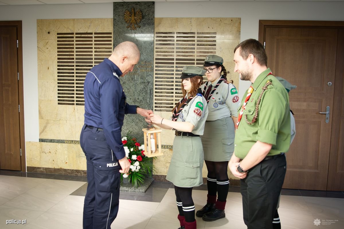 Przedstawiciele Związku Harcerstwa Polskiego - Maciej Szczęsny, Anna Pietrzak, Nikola Pawlak oraz Oliwia Polanowska - przekazali dzisiaj na ręce I Zastępcy Komendanta Głównego Policji nadinsp. Romana Kustera Betlejemskie Światło Pokoju - symbol dobra, braterstwa, nadziei i pokoju. Płomień niesiony przez skautów w wielkiej sztafecie przez kraje i kontynenty obiega świat. Takim darem skauci z całej Europy, a wśród nich harcerki i harcerze ZHP, pragną podzielić się ze wszystkimi. Niosąc lampiony ze Światłem do szkół, urzędów, domów, szpitali i parafii krzewią największe uniwersalne wartości braterstwa i pokoju. W tym roku Betlejemskiemu Światłu Pokoju towarzyszy hasło: "Pielęgnuj dobro w sobie".
