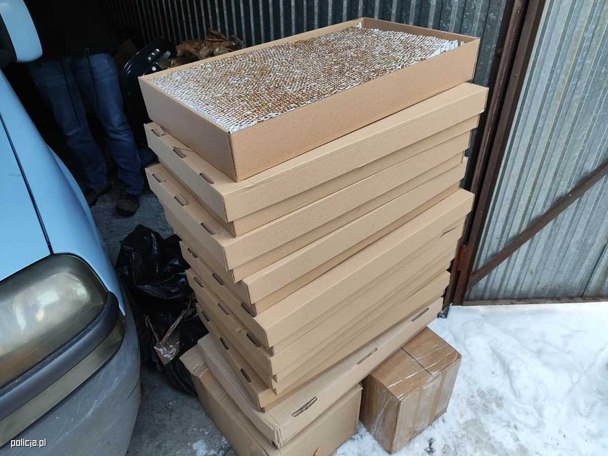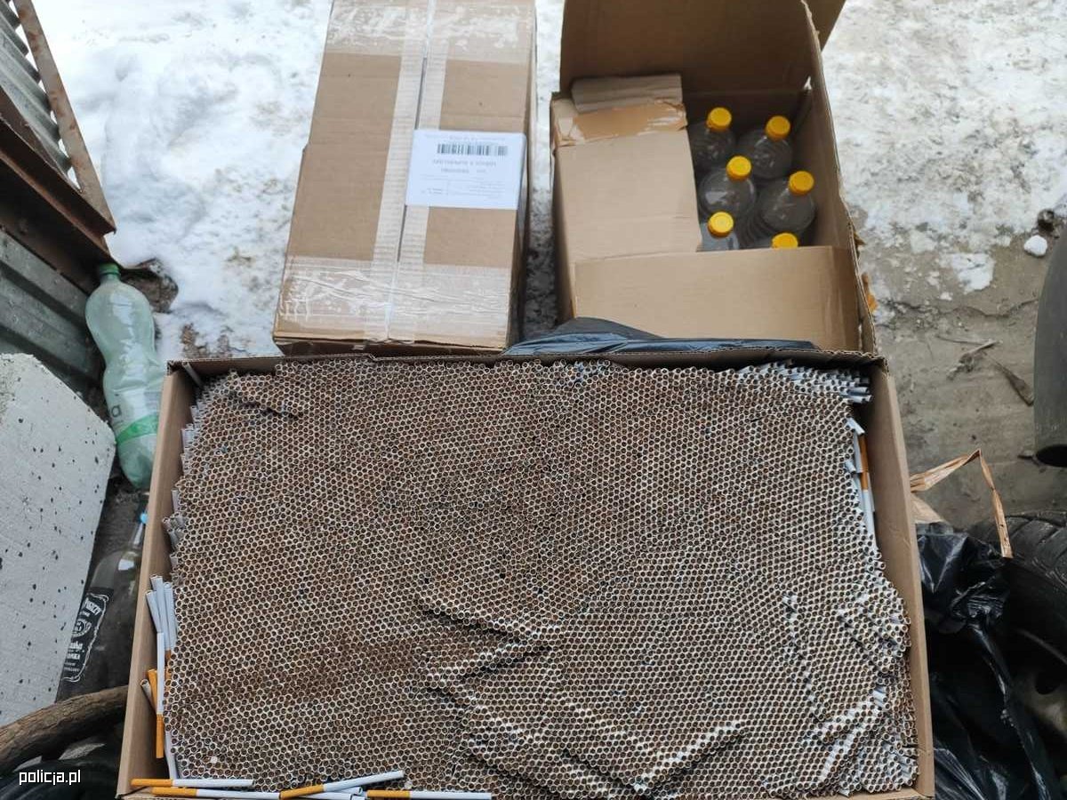 Na tym jednak policjanci nie zakończyli swoich działań. Postanowili sprawdzić posesję przy ul. Limanowskiego, z której wcześniej wyjeżdżał mężczyzna. Na miejscu zobaczyli szereg garaży i pomieszczeń gospodarczych. Świeże ślady na śniegu prowadziły do jednego z nich. W jego wnętrzu funkcjonariusze znaleźli cztery kartony z butelkami PET o pojemności jednego litra, wypełnionymi cieczą o zapachu alkoholu oraz dwie torby z tytoniem, każda o wadze około 0,5 kg.