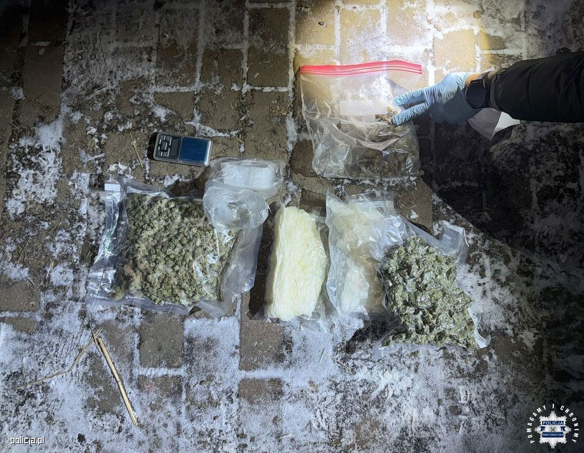 unkcjonariusze podczas przeszukania znaleźli i zabezpieczyli 50 gramów środka odurzającego 3-CMC oraz dwie porcje marihuany. Mężczyzna trafił do policyjnej celi. W wyniku czynności wykrywaczach policjanci ustalili, że narkotyki może posiadać także jego znajomy, 26-letni mieszkaniec powiatu pińczowskiego. Śledczy pojechali do jego miejsca zamieszkania. Tam zabezpieczyli środek odurzający - substancję 3-CMC o wadze ponad 1,1 kilograma, susz konopi innych niż włókniste o wadze ponad 700 gramów oraz 1 gram amfetaminy. Funkcjonariusze ujawnili także pieniądze w wysokości 102 tys. złotych. Także ten mężczyzna został zatrzymany.