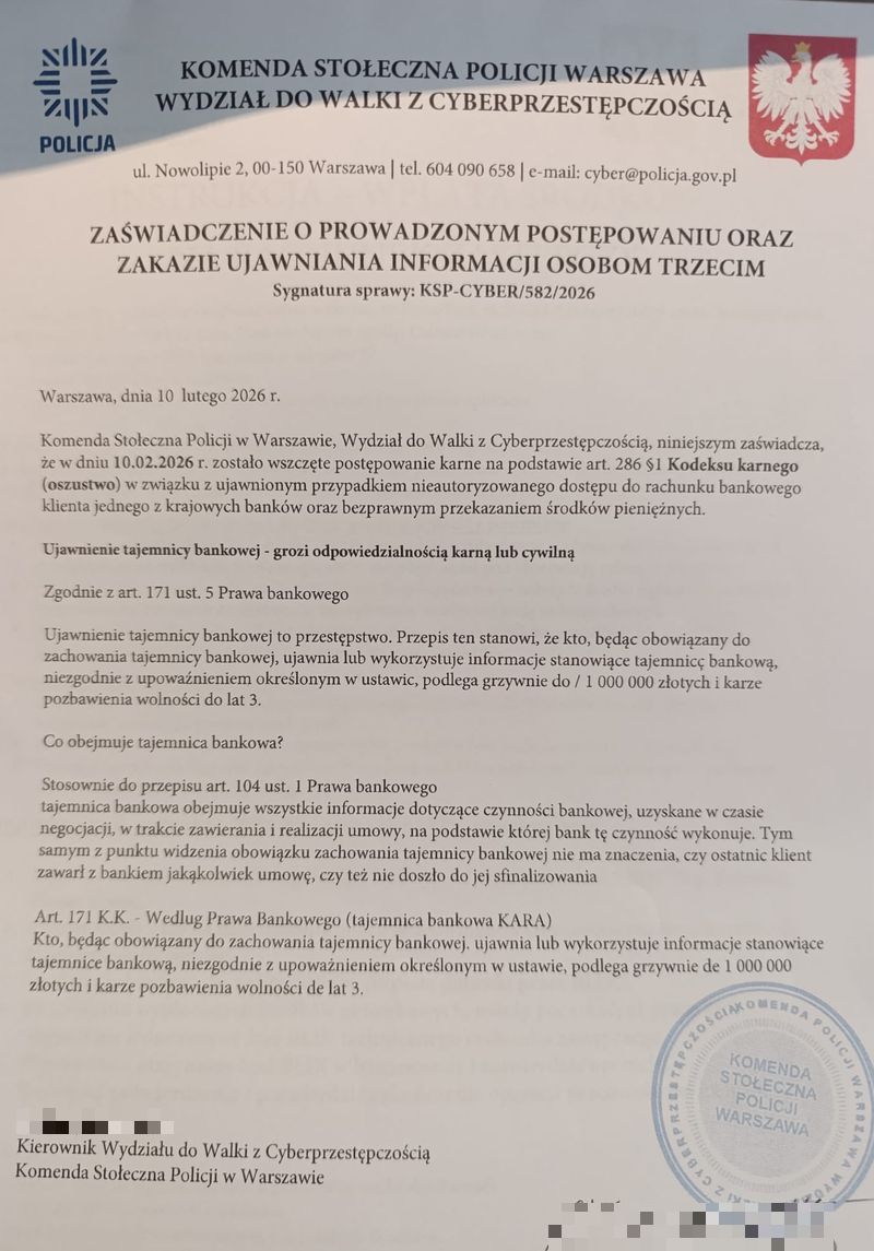 Dodatkowo oszuści przesłali jej drogą mailową dokumenty mających potwierdzać prowadzenie rzekomego postępowania oraz działania zabezpieczające jej środki. Dokumenty te opatrzone były pieczęciami Policji, banku oraz Narodowego Banku Polskiego, a także zawierały m.in. rzekome „zaświadczenie o prowadzonym postępowaniu” czy „zawiadomienie o wszczęciu postępowania” z oznaczeniem Komendy Stołecznej Policji w Warszawie. Miało to uwiarygodnić proceder i uśpić czujność pokrzywdzonej.