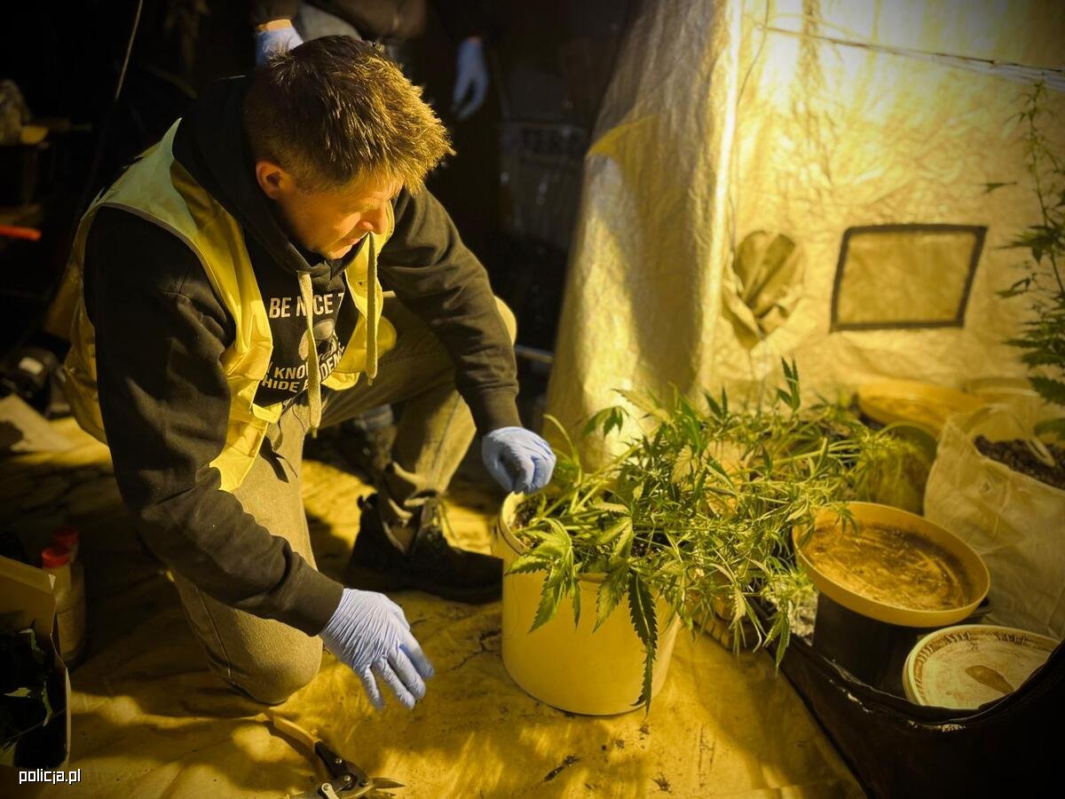 Po dotarciu pod ustalony adres, stróże prawa zauważyli podejrzewanego mężczyznę, który wychodził z wytypowanego lokalu. Natychmiast został wylegitymowany. 46 - latek podczas rozmowy przyznał, że posiada w mieszkaniu narkotyki. Przeszukanie potwierdziło, że miał schowane w słoiku substancje zabronione prawem. Intensywny zapach marihuany unoszący się w mieszkaniu, nie dawał spokoju policjantom. Ich przypuszczenia szybko się potwierdziły, gdyż w garderobie jedna ze ścian miała dziurę, która prowadziła do … nielegalnej plantacji. Pomieszczenie, w którym się znajdowała, wyposażone było w specjalistyczny sprzęt niezbędny do uprawy konopi, m.in. odpowiednie oświetlenie, wentylację, ogrzewanie oraz nawodnienie.