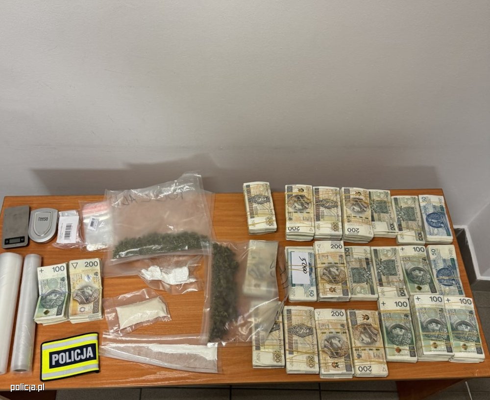 Następnie policjanci weszli do mieszkania, do którego pasowały znalezione przy nim klucze. Tam znaleźli ukryte w szafkach opakowania z białym proszkiem, kryształkami i suszem roślinnym oraz wagi elektroniczne, puste woreczki i zgrzewarkę do folii. W innym miejscu zabezpieczyli także kolejny plik banknotów.