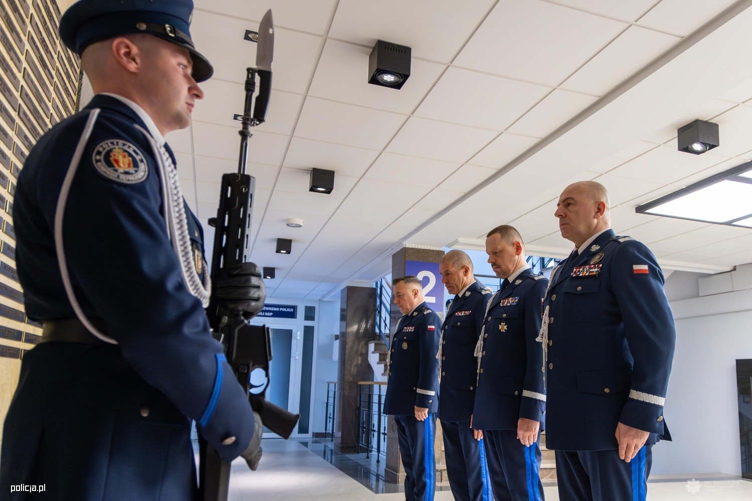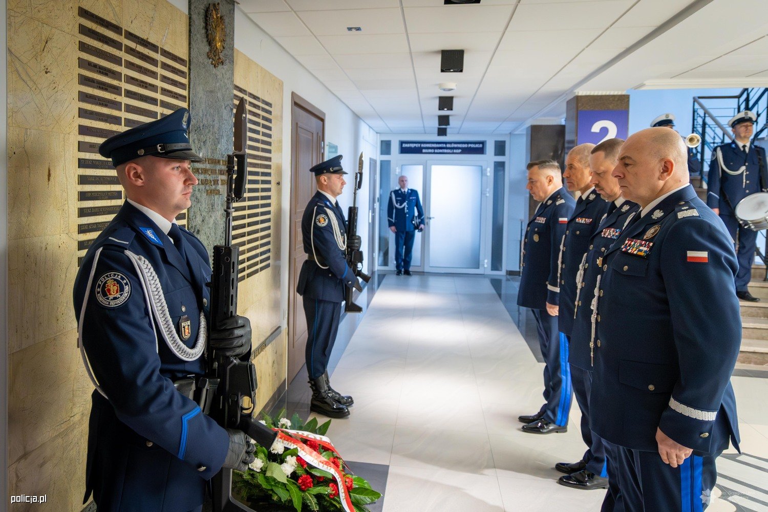 Dziś, 3 kwietnia, Komendant Główny Policji gen. insp. Marek Boroń wspólnie z zastępcami: nadinsp. Romanem Kusterem, nadinsp. dr. Rafałem Kochańczykiem oraz nadinsp. dr. Tomaszem Michułką złożyli kwiaty przed obeliskiem „Poległym Policjantom - Rzeczpospolita Polska” oraz przed Tablicą Pamięci w siedzibie Komendy Głównej Policji.
