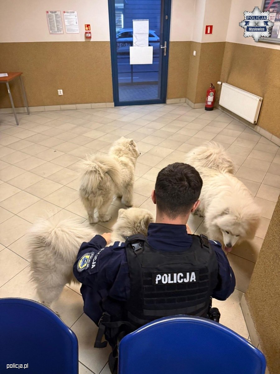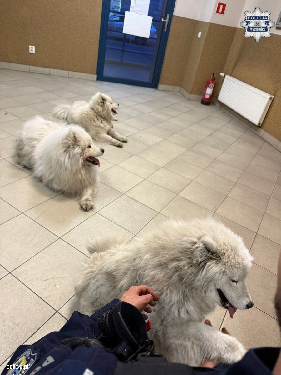 Do nietypowej interwencji doszło w niedzielę, 5 kwietnia br., chwilę po godzinie 19:00. Dyżurny mysłowickiej jednostki odebrał zgłoszenie od obywatela, który zauważył trzy białe psy biegające po ulicy Towarowej. Policjanci z Mysłowickiej patrolówki zabezpieczyli zwierzęta, a następnie, by zapobiec ich kolejnej ucieczce, postanowili "zaprosić" je do komendy, gdzie mogły przeczekać w bezpiecznych warunkach do czasu ustalenia ich właściciela.