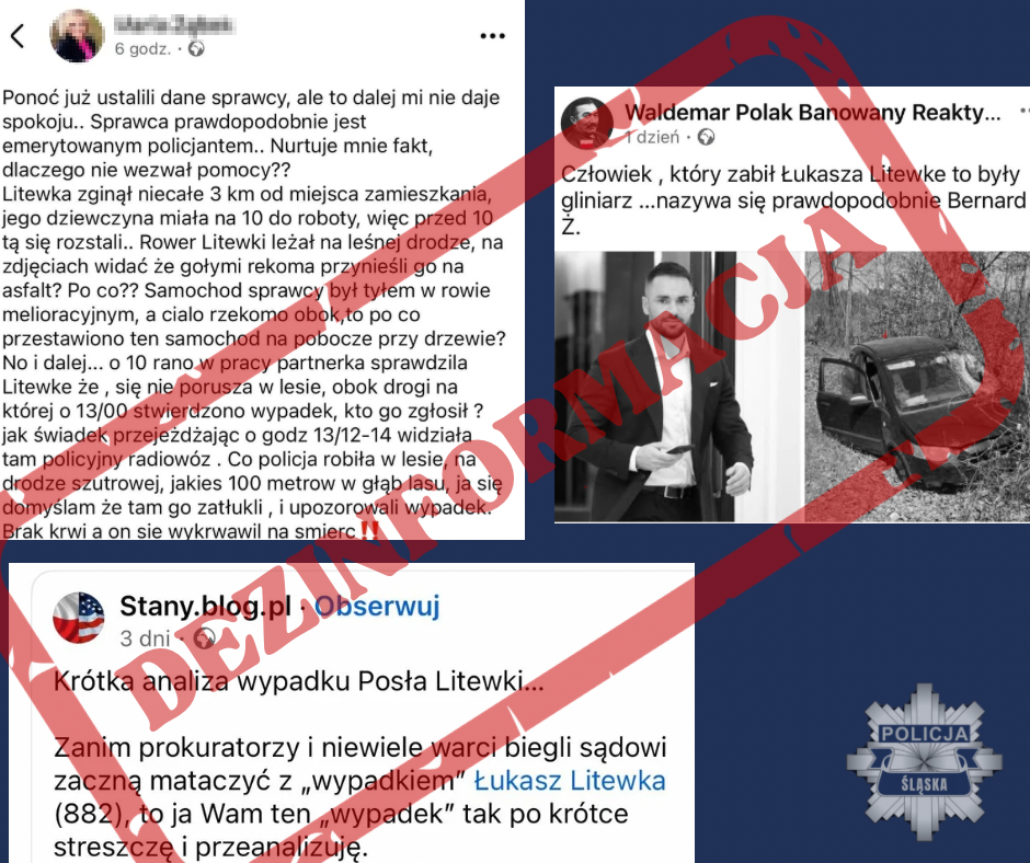 W związku z tragicznym wypadkiem drogowym, w którym zginął poseł Łukasz Litewka, w przestrzeni internetowej rozpowszechniane są liczne coraz bardziej „sensacyjne” informacje, spekulacje oraz treści wprowadzające w błąd. Jedną z ostatnich jest informacja o rzekomym zatrzymaniu partnerki posła i jeszcze bardziej bulwersująca, że zatrzymany kierowca był funkcjonariuszem Policji.