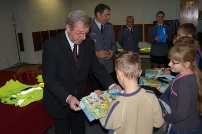 Ponadto każde dziecko uczestniczące w dzisiejszym spotkaniu dostało opaskę odblaskową. Najlepsi z uczniów, którzy odpowiedzieli na pytania z przygotowanego mini-konkursu z zakresu szeroko pojętego bezpieczeństwa, zostali nagrodzeni dodatkowymi upominkami. Na zakończenie spotkania dzieci w towarzystwie policjantów oglądały sprzęt będący na wyposażeniu policji oraz mogły sprawdzić swoją celność strzelając na urządzeniu służącym do tzw. "treningu bezstrzałowego".