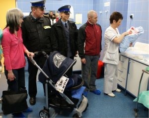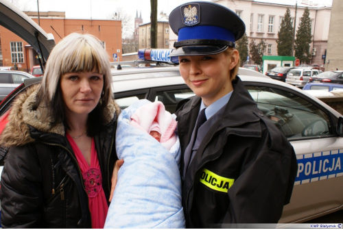 Przed kilkoma dniami w III białostockim komisariacie urodziło się dziecko. Maleństwo "nie chciało" zaczekać na położną. Przyszło na świat prosto w objęcia policjantki, która razem z koleżanką odebrała poród. Szczęśliwa matka razem z pociechą-wcześniakiem trafiła do białostockiego szpitala. Dzisiaj stan malutkiej dziewczynki był już na tyle dobry, że lekarze zdecydowali o wypisaniu jej ze szpitala. W tym momencie po raz kolejny byli przy matce i jej dziecku policjanci z "trójki". Do szpitala zawitali z prezentem. Niespodzianką był ufundowany ze składek funkcjonariuszy dziecięcy wózek – oczywiście niebieski. Okazało się również, że rodzice swojej trzeciej córce, a za razem siódmemu już dziecku, nadali imię Pola Aniela. Jak powiedzieli - to na cześć policjantki odbierającej poród. 37-letnia matka, dziękując mundurowym za życzenia i prezent, mówiła, że jest dumna z białostockich policjantów. Rodziców i pociechę do domu odwiózł policyjny radiowóz.