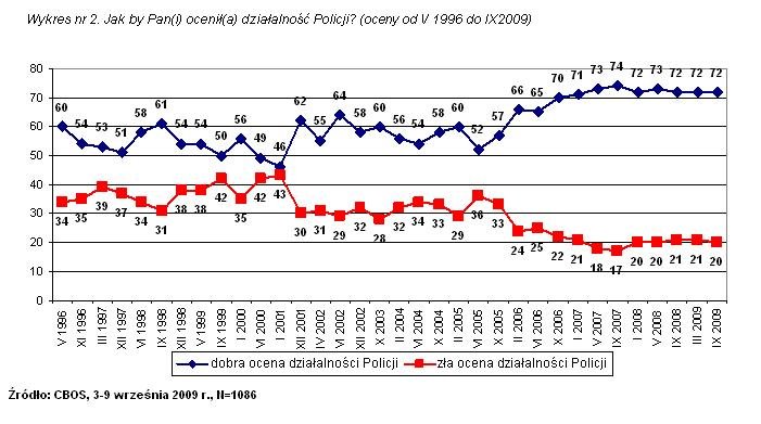 Notowania Policji są bardzo dobre i stabilne. Od dwóch lat pozytywne opinie o pracy naszej instytucji wyraża blisko trzy czwarte respondentów (obecnie 72%, tak samo jak w marcu 2009 roku), natomiast negatywne – jedna piąta (obecnie 20%). Zdania na ten temat nie ma 8% Polaków (Wykresy nr 1 i nr 2).