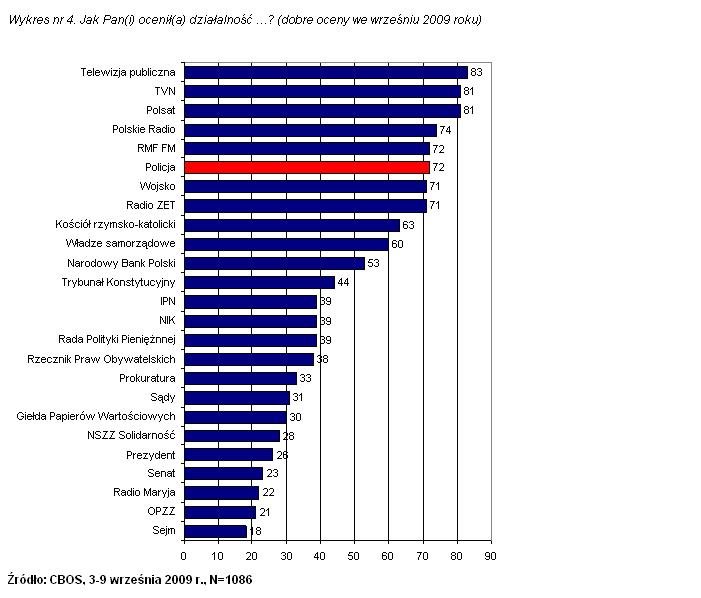 W badaniu ocenie poddano m.in. media publiczne i prywatne, Kościół, władze, instytucje finansowe, związki zawodowe, wojsko oraz instytucje wymiaru sprawiedliwości. Policja jest jedną z najlepiej ocenianych instytucji w Polsce (Tabela nr 1 oraz Wykres nr 3, Wykres nr 4). Respondenci lepiej oceniają tylko media. Należy podkreślić, że Policja została oceniona zdecydowanie wyżej, niż instytucje wymiaru sprawiedliwości, takie jak sądy i prokuratura. (Tabela nr 1 oraz Wykres nr 3, Wykres nr 4). Oceny tych instytucji są najniższe od 3 lat, natomiast notowania Policji od 3 lat utrzymują ten sam wysoki poziom.