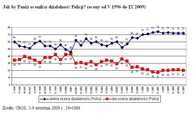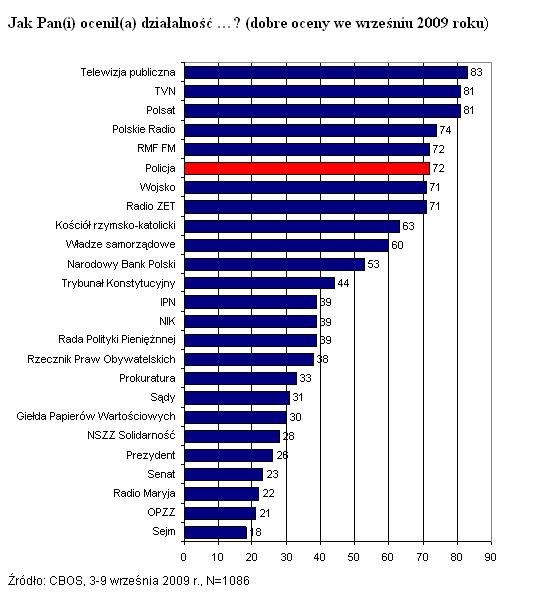 W badaniu, które odbyło się w dniach 3 – 9 września, ocenie poddano 25 podmiotów, m.in. media publiczne i prywatne, władze samorządowe, instytucje finansowe, związki zawodowe, wojsko oraz instytucje wymiaru sprawiedliwości. Na wysokim, bo szóstym miejscu, znalazła się Policja. Wyprzedziły ją tylko trzy stacje telewizyjne i dwie radiowe. Od dwóch lat pozytywne opinie o pracy naszej formacji wyraża blisko trzy czwarte respondentów (obecnie 72 proc.), natomiast negatywne – jedna piąta (obecnie 20 proc.).