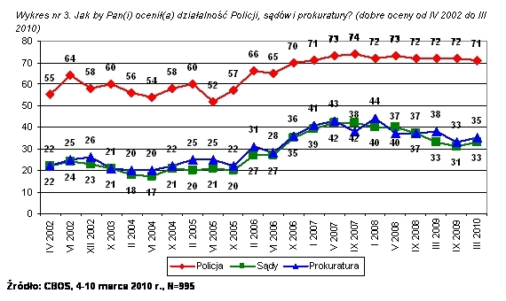 Policja znajduje się na piątym miejscu z dwudziestu siedmiu ocenianych instytucji. Wyżej od niej są tylko niektóre media. Należy podkreślić, że Policja została oceniona zdecydowanie wyżej niż inne instytucje wymiaru sprawiedliwości, takie jak sądy i prokuratura - odsetek wskazań pozytywnych w przypadku Policji jest ponad dwukrotnie wyższy. Warto również zwrócić uwagę, że Policja w marcu 2010 roku jest lepiej oceniana niż wojsko, które we wcześniejszych edycjach badania nieznacznie ją w tym obszarze przewyższało (wykres nr 3, wykres nr 4 oraz tabela nr 1).