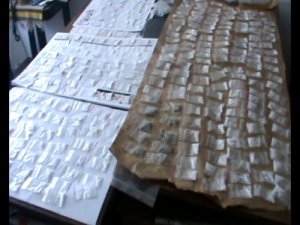 Podczas przeszukania różnych pomieszczeń, m.in. zamkniętego przez służby sanitarne sklepu z dopalaczami, zabezpieczono 30 gramów amfetaminy i 10 gramów dopalaczy zawierających narkotyk. Przy zatrzymaniu kilku podejrzewanych policyjni antyterroryści musieli sforsować drzwi. Przestępcy w tym czasie usiłowali pozbyć się narkotyków. Podczas przeszukania zabezpieczono także gotówkę, wagę i dilerki oraz płytki i pałeczki do porcjowania narkotyków, których nieudolnie próbował pozbyć się 40-letni zatrzymany o pseudonimie Gruby. Jako materiał dowodowy przejęto także komputer z oprogramowaniem służącym do drukowania opakowań nielegalnych dopalaczy zawierających narkotyki.